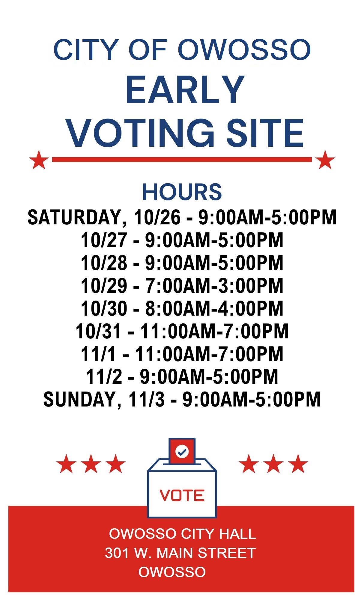 In the State of Michigan you vote in the precinct in which you reside. Your Voter ID Card will provide the location of your polling place as well as the voting districts in which you live. If you’ve lost your Voter ID Card, this information can be obtained by visiting the Michigan Voter Information Center, or by calling the Owosso City Clerk’s Office at (989) 725-0500.